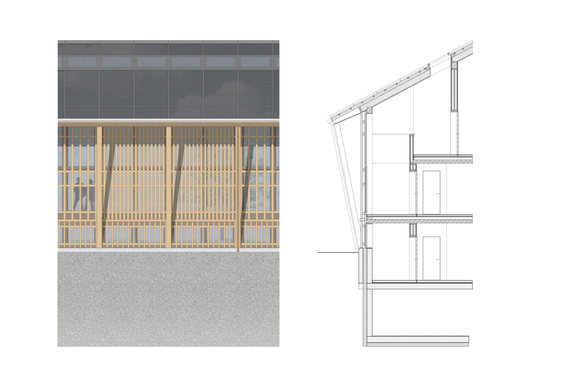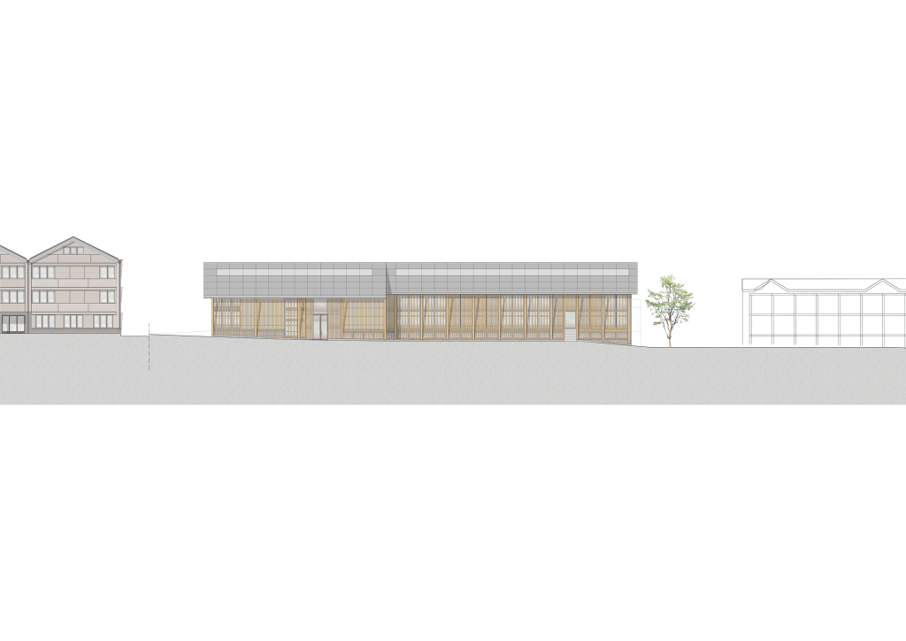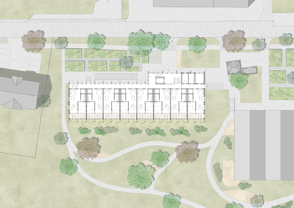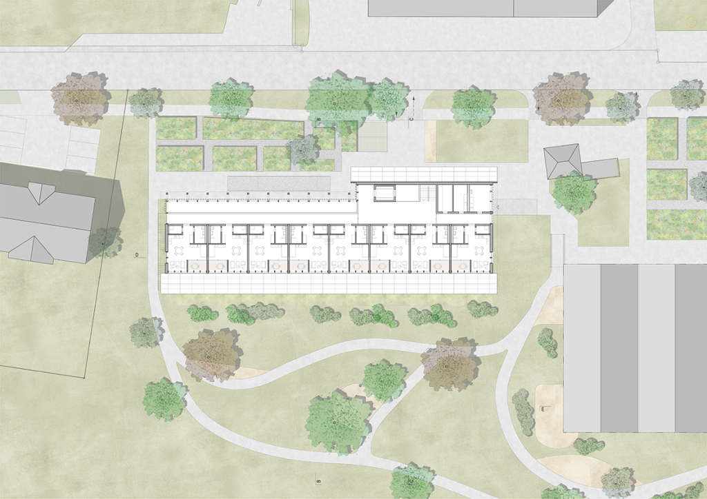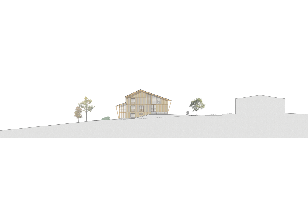 Das Wohngebäude versteht sich ortsbaulich und architektonisch als Kontrapunkt zum Pflegezentrum. Dieses Haus ist kein öffentliches Gebäude, hier wird einfach gewohnt. Die Wohnungen sind zusammengefasst unter einem grossen Dach und bilden eine Gemeinschaft. Die hellen, breiten witterungsgeschützten Laubengänge fördern die Kommunikation und auch die attraktiven Waschräume laden zu einem Schwatz ein.